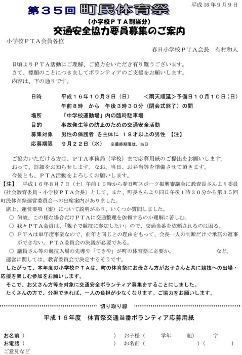 2004 年 10 月 10 日 更新 10月10日(日)は、小学校の校庭不良のため中止。 応募いただいた有難うございました。 10月3日(日)は、10日(日)に雨天延期。 小学校PTA からの お願いです ご協力者の方に、当日、町よりお弁当が支給されます。 なお、Tシャツは、だめでした。 PDF